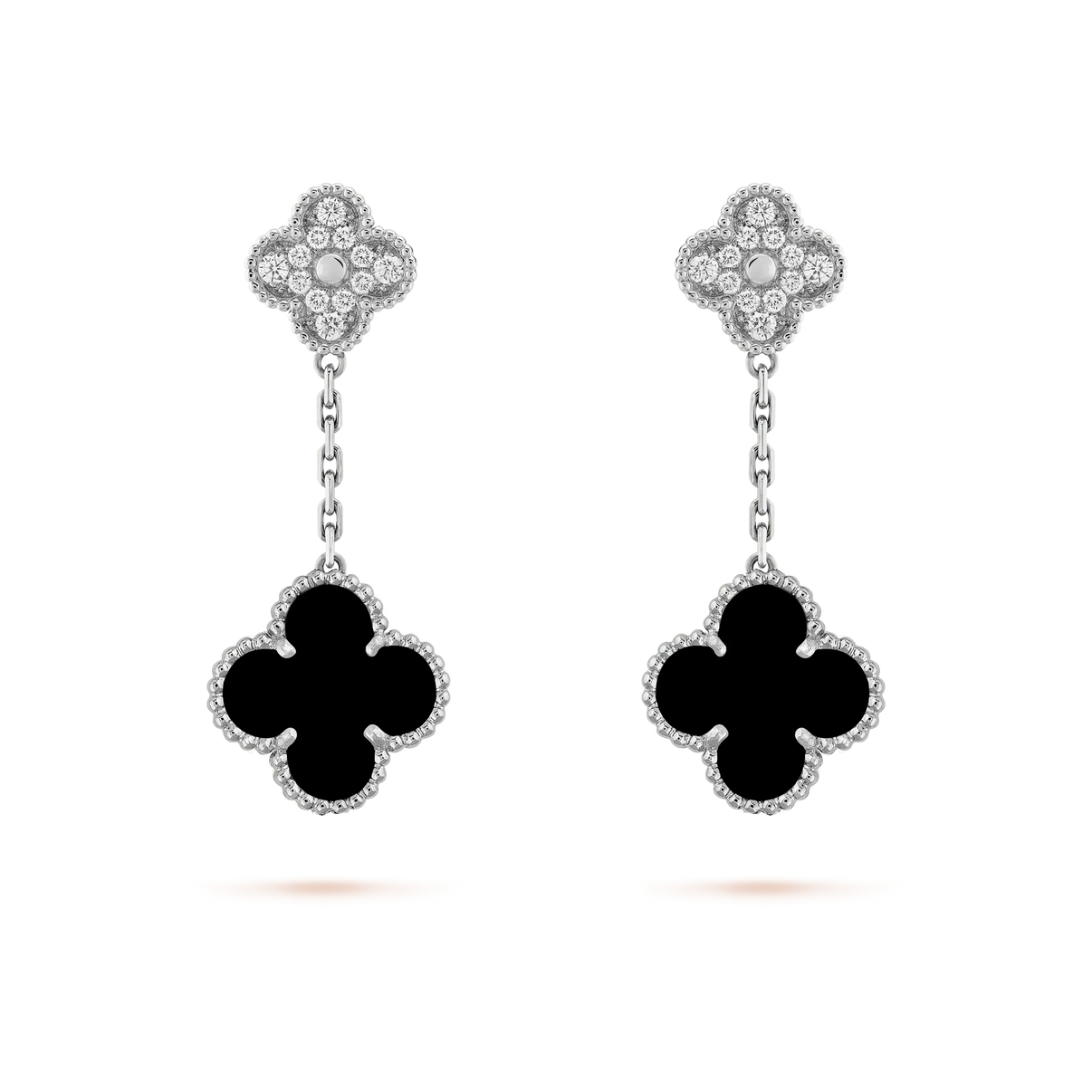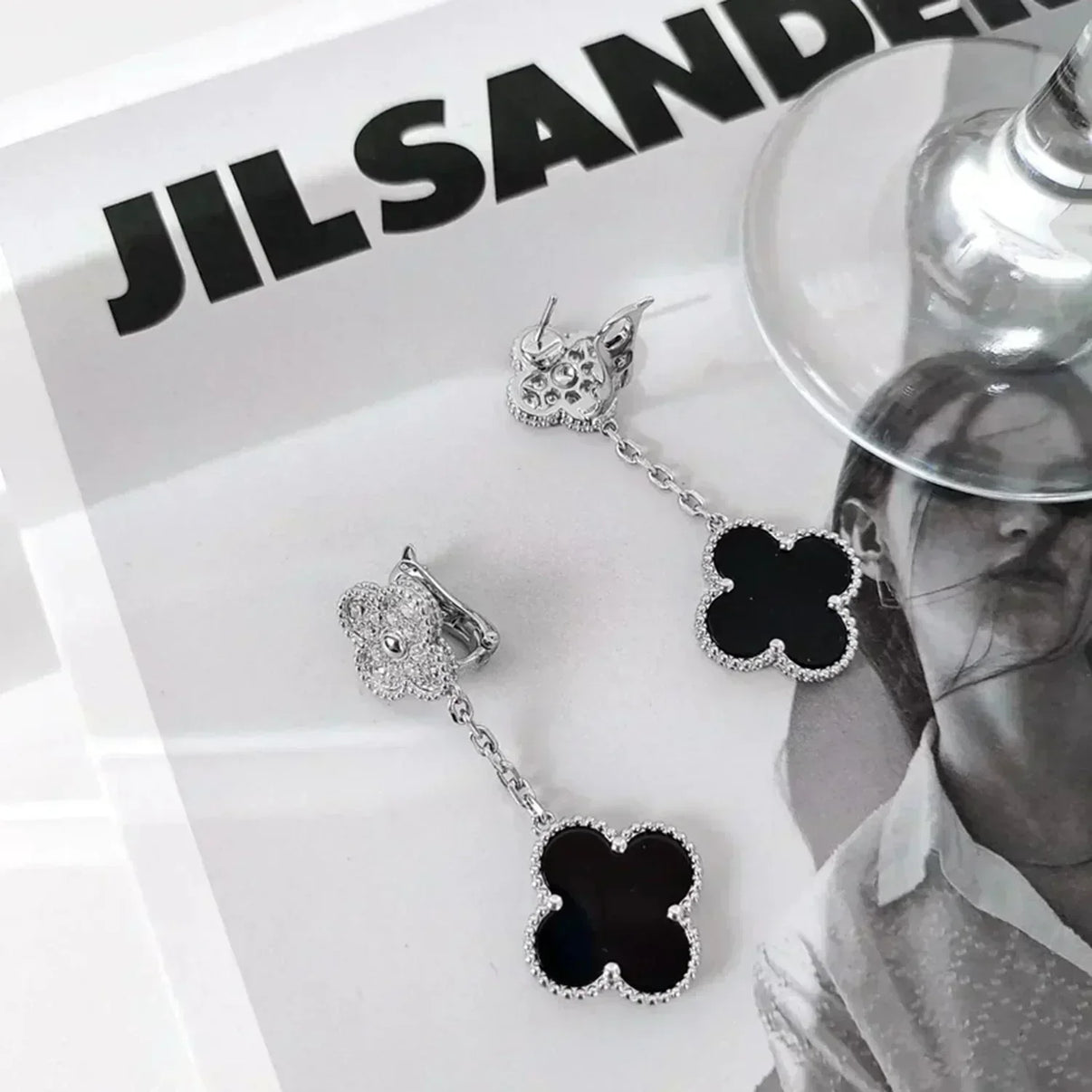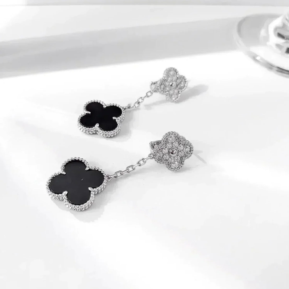 [Luna Brilliance]CLOVER 2 MOTIFS DIAMOND ONYX EARRINGS SILVER